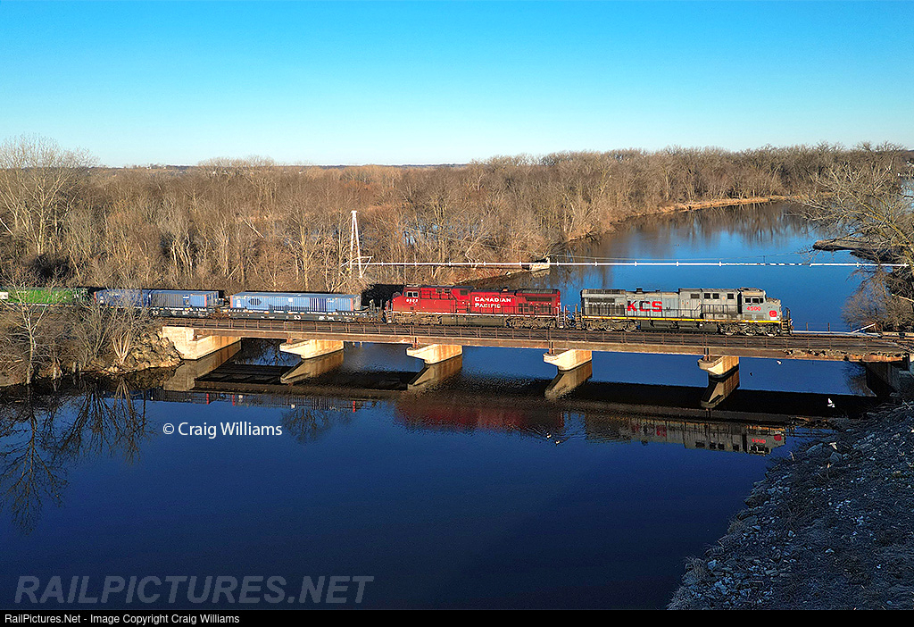 We were able to shoot both CPKC Midwest Mexico Express (MMX) trains around Ottumwa. The 2 181 trains this weekend arrived 6 hour difference between days. The180 seemed to arrive right around the 7-8am area at Ottumwa since the train is only around 300 miles into the trip. Saturday, the pair met at Newtown, and on Sunday, they met right at Ottumwa. 181 leaves Ottumwa with a gray KCSM leader and 3400 feet of train, seen here crossing Des Moines River just north of the yard.