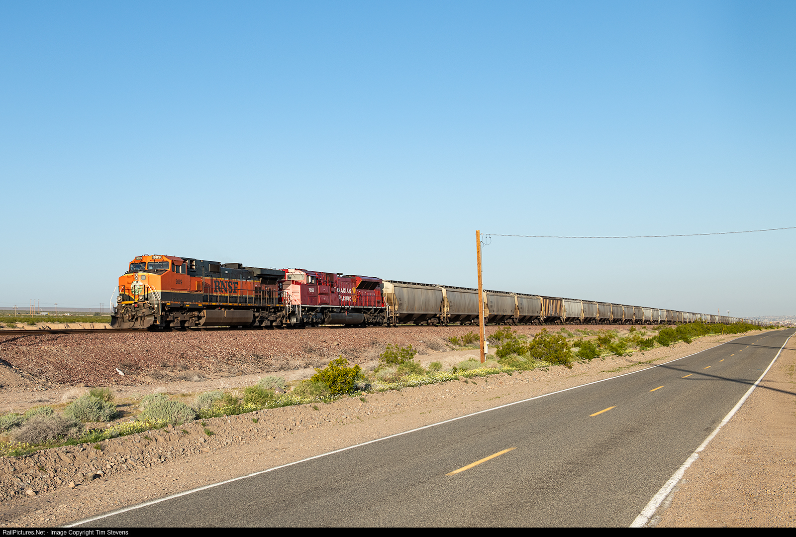 BNSF C44-9W 989 and CP SD70ACU 7055 shove a westbound loaded canola meal train towards Barstow.
