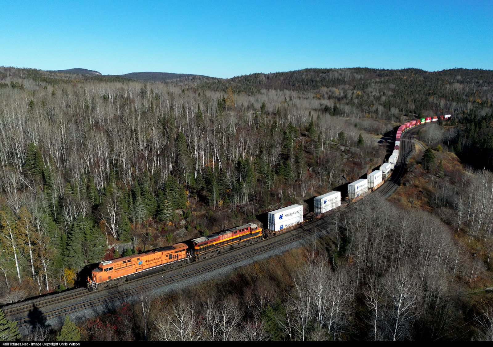 A week of steady wind knocked the leaves off the trees as 113 climbs the grade through Coldwell with CPKC's Hapag Lloyd painted locomotive on the point