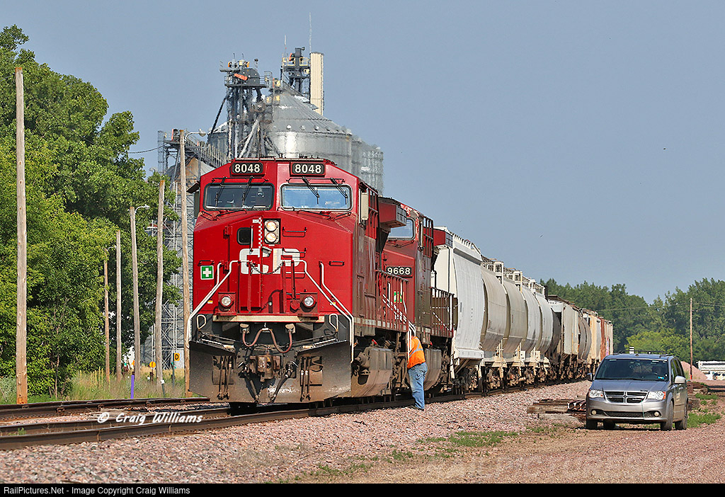 | At the far end of the CP Tracy Sub is train 470 beginning its trip from Tracy to Chicago. This is old DM&E trackage that Hunter Harrison sold off in 2014 to the Genesee & Wyoming. RCP&E inbound traffic was light on this Sunday as 470 would only depart with 15 cars for the east with work at New Ulm. Here the crew works around to get power together for the outbound train. CP retain 231 miles of trackage from Minnesota City to Tracy, while the rest of it was sold off. Not real sure how much traffic the CP still gets here? |