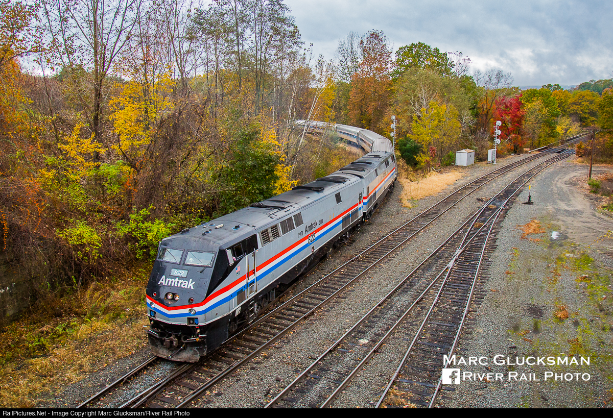 Autumn Express At The Deerfield River. Amtrak's 3rd Annual Autumn Express covered the former Boston & Maine Railroad from Albany-Rensselaer, New York to East Deerfield, Massachusetts on Sunday, October 25, 2015. With a substantial consist of Phase III painted P40DC AMTK 822 and P42DC AMTK 145 back to back and 11 AmFleet cars, this sold out excursion was the first passenger train to coverage most of this mileage in decades and has not been repeated since. For five years from 2013-2017, the "Autumn Express" traversed rare freight mileage in the northeast, giving passengers an opportunity to both take in the fall foliage and experience routes that were seldom visited by the public on trains. The train is seen backing onto the wye at the Deerfield River in East Deerfield, Massachusetts.