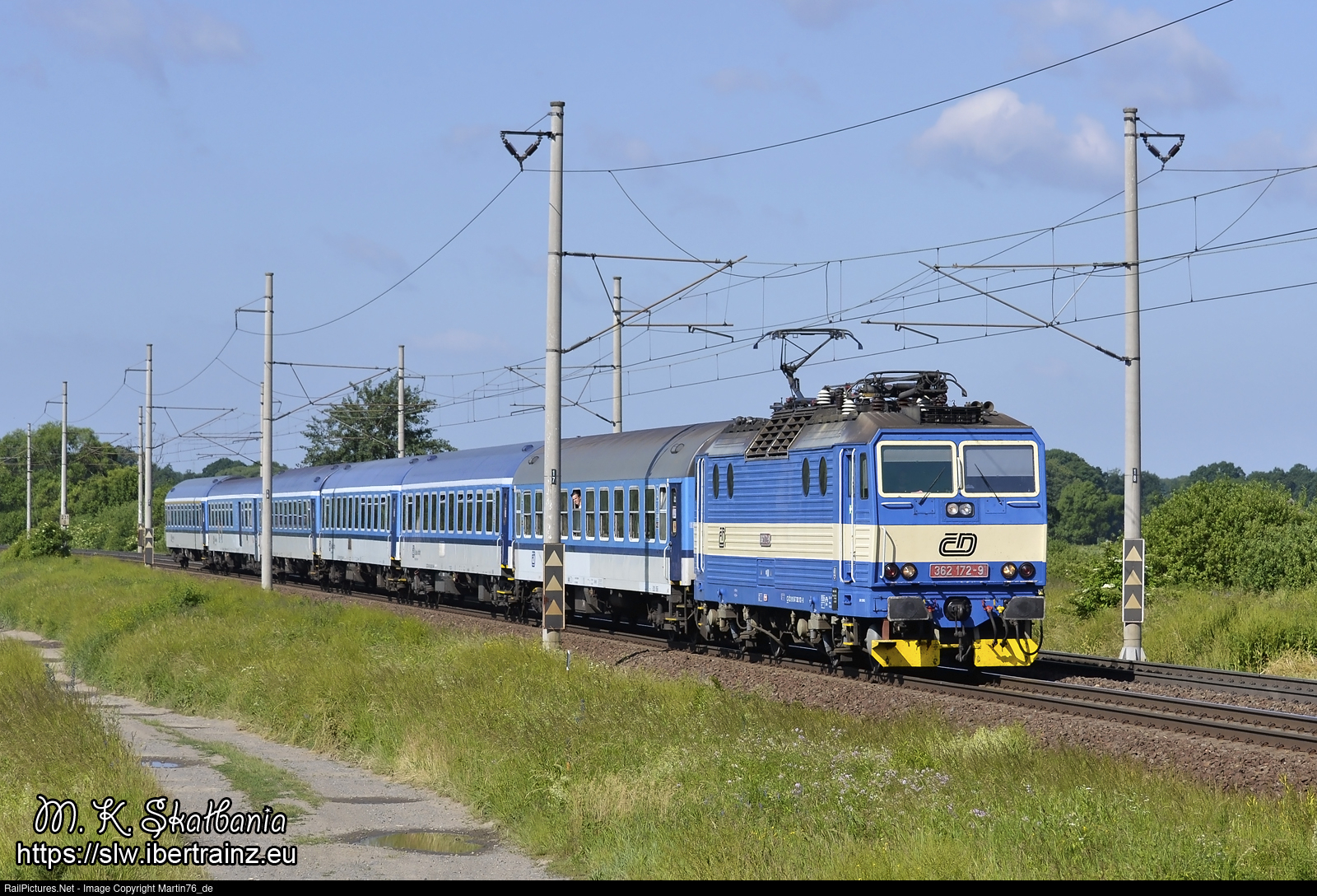 The electric locomotive 362.172-9 hauling a passenger train from Praha hl. n. to Bohumin hl. n.