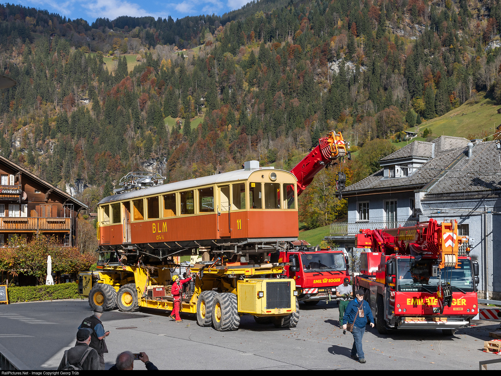 The 4.7-kilometre-long meter-gauge adhesion railroad, also known as the “Panoramabahn” from Grütschalp to Mürren (BLM Bergbahn Lauterbrunnen-Mürren) is the continuation of the aerial cableway from Lauterbrunnen to Grütschalp. The traction vehicle fleet is currently being completely replaced. Three new articulated railcars Be 4/6 # 101 to # 103 from StadlerRail are being put into operation. The previous vehicles all had to be transported from Winteregg station some 780 meters downhill over narrow forest roads to Lauterbrunnen, just like the new ones in opposite direction. On this day, the CFe 2/4 (BDe 2/4) # 11 railcar, built in 1913 by SIG and MFO, was transported away with the special vehicle “Castor + Pollux”. For many years, it had only been used very rarely for special trips. It will be on display at the Swiss Transport Museum (VHS) in Lucerne from summer 2025. The "Castor + Pollux" special vehicle just reached the station square of Lauterbrunnen with railcar # 11 loaded.