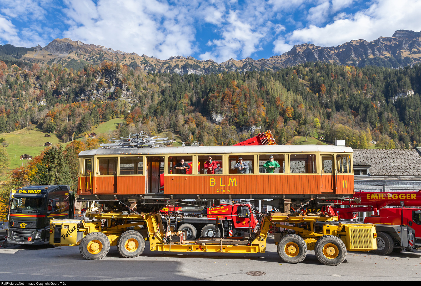 The 4.7-kilometre-long meter-gauge adhesion railroad, also known as the “Panoramabahn” from Grütschalp to Mürren (BLM Bergbahn Lauterbrunnen-Mürren) is the continuation of the aerial cableway from Lauterbrunnen to Grütschalp. The traction vehicle fleet is currently being completely replaced. Three new articulated railcars Be 4/6 # 101 to # 103 from StadlerRail are being put into operation. The previous vehicles all had to be transported from Winteregg station some 780 meters downhill over narrow forest roads to Lauterbrunnen, just like the new ones in opposite direction. On this day, the CFe 2/4 (BDe 2/4) # 11 railcar, built in 1913, was transported away with the special vehicle “Castor + Pollux”. For many years, it had only been used very rarely for special trips. It will be on display at the Swiss Transport Museum (VHS) in Lucerne from summer 2025. The staff of the transport down from the Winteregg to Lauterbrunnen showed up in the windows of the railcar for a farewell picture.