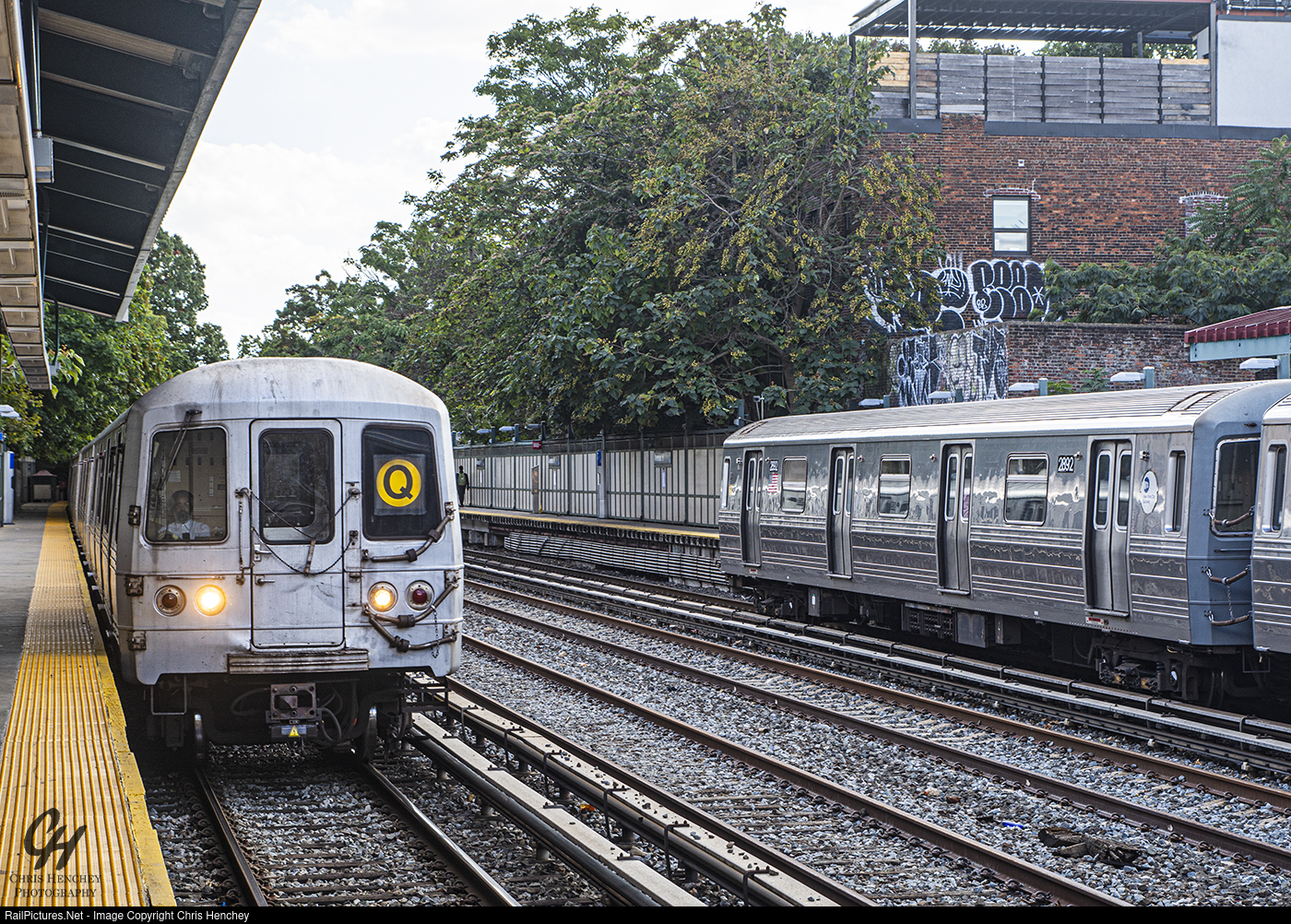 A Manhattan bound Q Train slows to a stop at Avenue H in the Midwood neighborhood of Brooklyn while a B or Q train for Southern Brooklyn slows to a stop on the opposite platform.