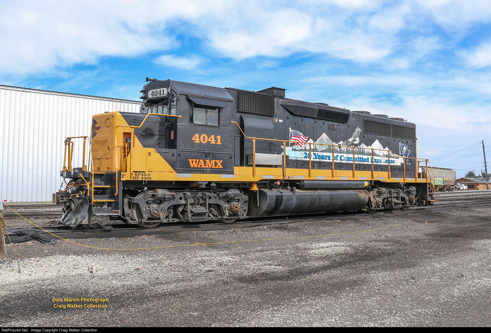 Eastern Idaho GP40-3 WAMX 4041 (ex-HLCX GP40-3 4401, ex-HLCX 3111, ex-KYLE 3111, ex-CR 3093, ex-PC 3093, née-NYC GP40 3093) in a special 20th anniversary paint scheme at the railroad's shops in Rupert, ID. When we got there the doors were open and a maintenance truck was parked in front of the unit. The mechanic was replacing an oil filter and had dropped a couple of them. I asked him is I could help him and handed the dropped filters up to him so he did not have to get off the locomotive. I asked him how long he was going to be and he told me a few more minutes and he would close all the doors and move his truck. (Rupert, Idaho – September 16, 2024). Dale Martin photograph, Craig Walker collection