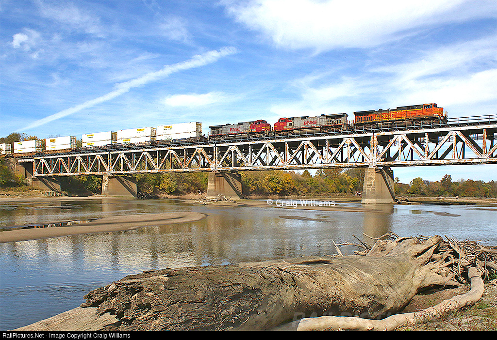 | Spent a beautiful morning along the Marceline Sub at the Des Moines River Bridge. I know its the Transcon, but we had a blast enjoying the nice October day. Surprisingly, the BNSF ran a few odd ball consists that all of us like too. Here a couple warbonnets adds color to a normally all orange railroad. The Des Moines River is where the Marceline Sub crosses from southern Iowa into northern Missouri. |