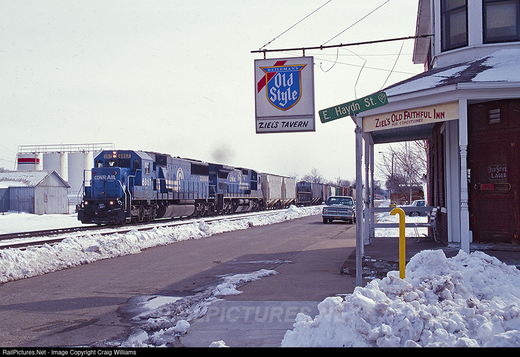 Back in 1998, Conrail power was running thru on the BNSF Aurora Sub. A pair of CR units power this Belt Railway to Northtown freight thru Prairie Du Chien, and past the famous Frazier Old Faithful Bar, which back then looks like it was Ziel's. The end of the Conrail was a done deal by the end of 1998, and these sites would soon end. The bar still sees plenty of orange GEs go by now.