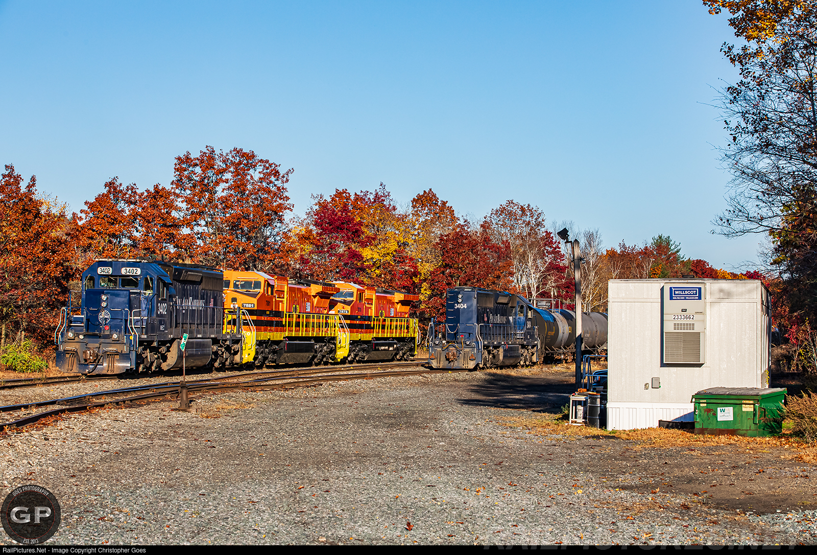 | Clear morning sunlight shined over the Rotter Junction Yard as Pan Am Railways MEC 3402 sits on the head end on a cut of power featuring the newly repainted B&E Dash 8's 7881 & 7878 from their former CSX to patched Pan Am paint with the MEC 3404 nosed into the yard. |