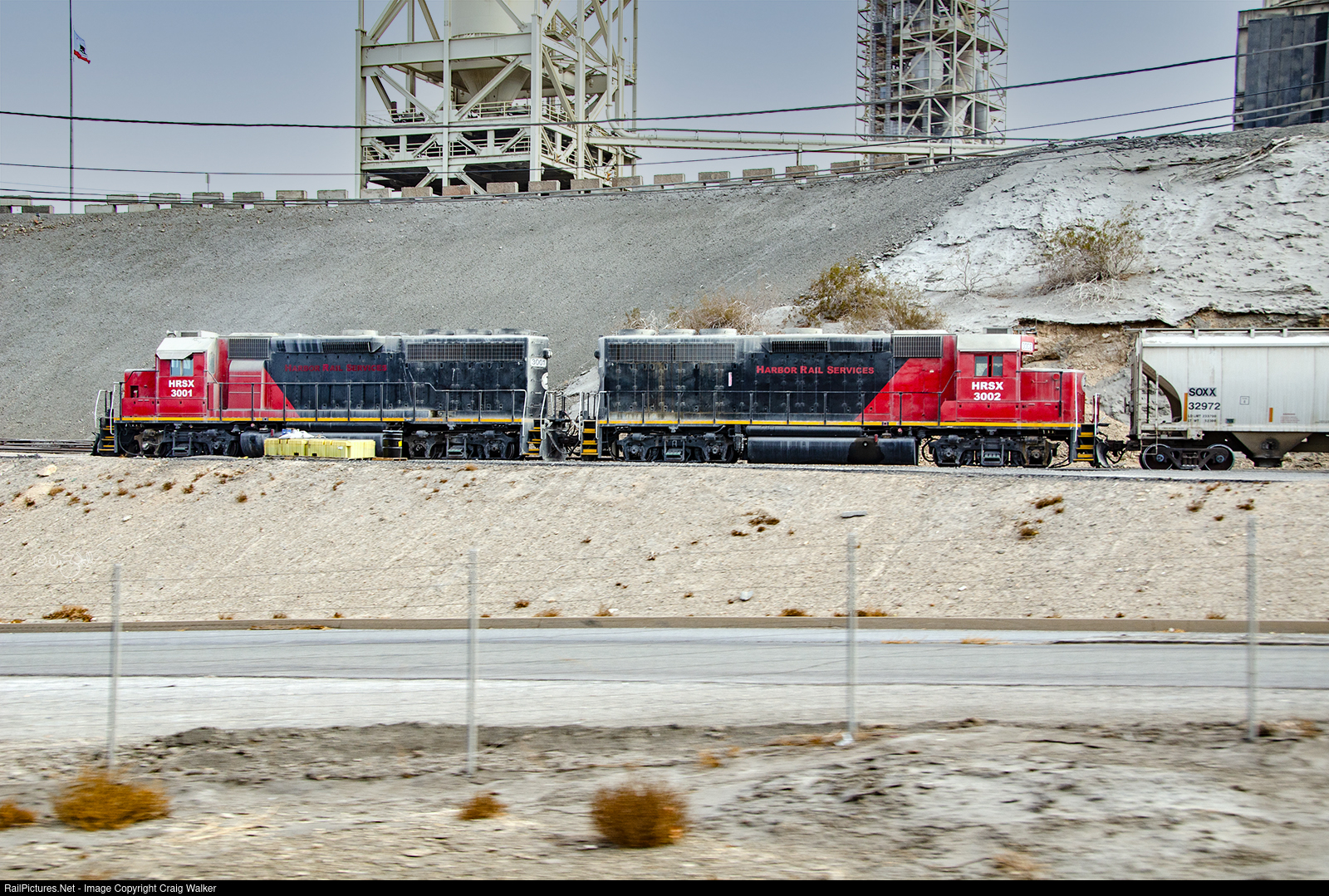 Switching cars at the Riverside Cement Company in Oro Grande are two GP40s originally purchased by Western Pacific Railroad, and now owned by Harbor Rail Services: 3001 and 3002. HRSX 3001 was built in September 1971 as WP 3542, later sold to Chicago Missouri & Western (as their 3024) and then Wisconsin Central (also 3024). HRSX 3002 was originally WP 3541, which was repainted red, white and blue and renumbered WP 1976 for the American Bicentennial in the mid-1970s, then renumbered back to WP 3541 afterward. As with WP 3542, 3541 was also sold to the CMNW (first retaining the number 3541, then renumbered 3023), later becoming Gateway Western Railroad 3023 before, eventually, also joining WC (as 3023). These two Geeps worked this plant for at least four years, as I first saw them here in 2013, and last spotted them here in 2017. (Oro Grande, California – December 12, 2016)