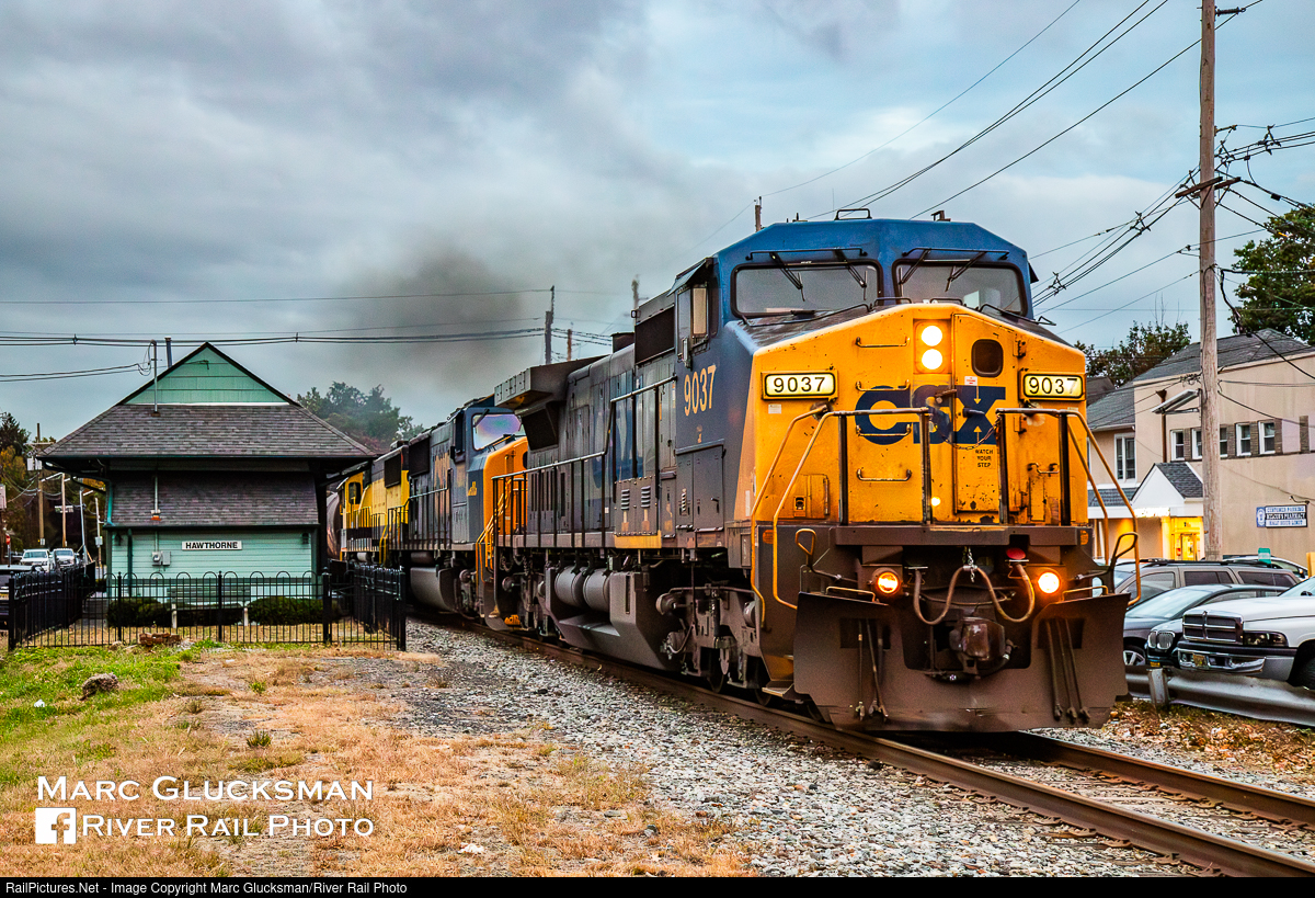 Howling Through Hawthorne. On October 26, 2018, during a power shortage on the New York, Susquehanna, and Western Railway, leased CSXT 9037 (C40-9W) leads CSXT 4589 (SD70MAC) and NYSW 3808 on the SU-99 to Binghamton, New York at dusk. The train is seen passing the former NYSW Hawthorne Station in Hawthorne, New Jersey, which was restored by the Volunteer Railroaders - VRA with private donations decades after it served its last commuter, and is still a favorite photo prop today.