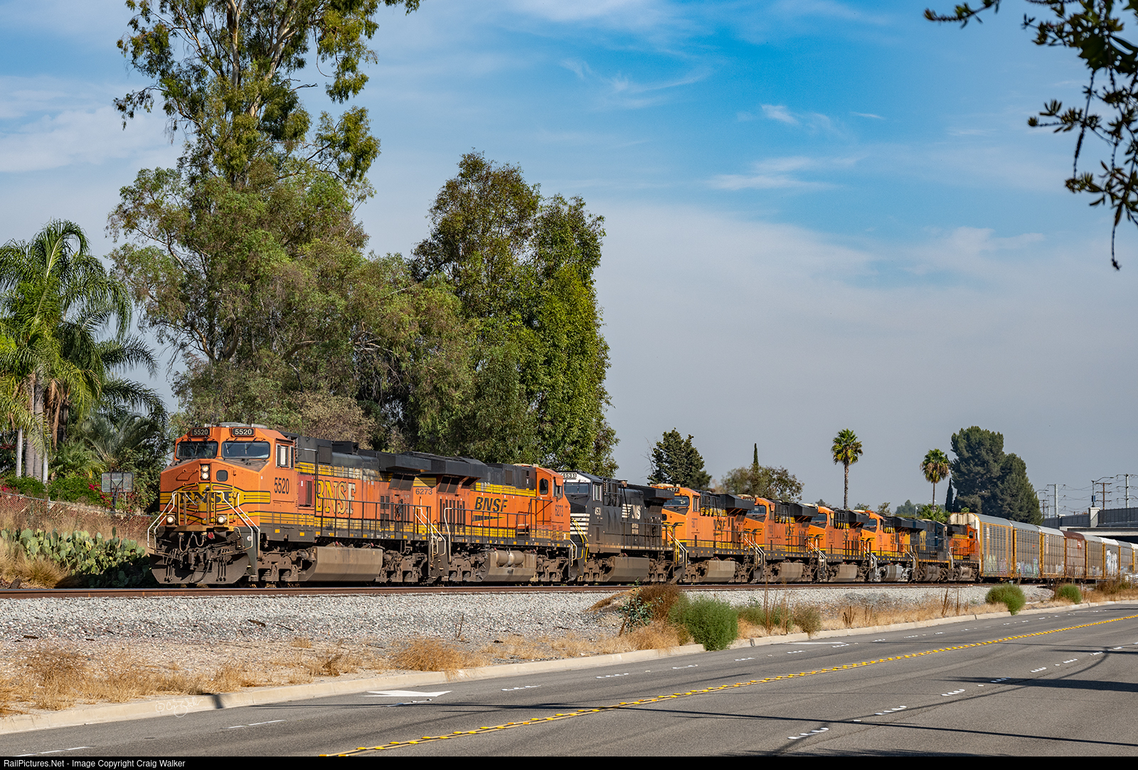 Perhaps there is a shortage of locomotives in the Los Angeles basin, as BNSF Railway train H-BARWAT1-26A, the daily Barstow CA to Watson CA freight train, has 11 locomotives for an 84-car train (38 loads and 46 empties, and weighing 6833 tons). That seems like a lot. Power for this train is (on the headend) BNSF (unless otherwise noted) Dash 9-44CW 5520, ES44C4 6273, Norfolk Southern AC44C6M 4531, ES44AC 5877, ES44DC 7839, ES44C4 6672, ES44DC 7796, CSXT ES44AC 893 and Dash 9-44CW 617, with Dash 9-44CWs 4138 and 4622 as the rear Distributed Power Units. (Placentia, California – October 26, 2024)