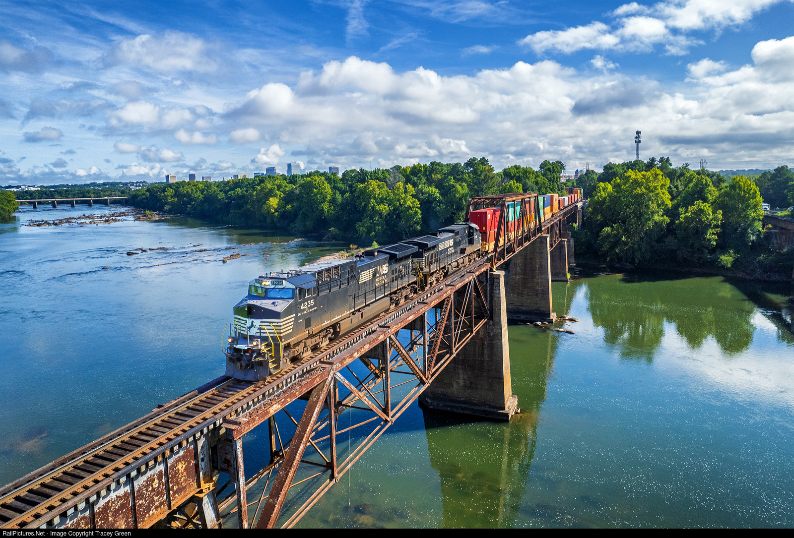 | If Pigs Could Run Over the River. Because of a reroute due to a derailment near Macon, a container train passes over the Congaree River heading south toward Augusta on the Southern's R Line. |