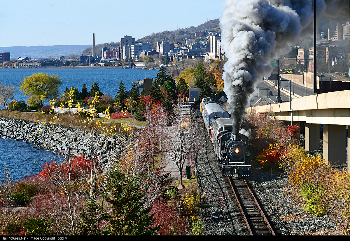 Thundering up Lemon Drop Hill out of downtown Duluth, MN DMIR 332 certainly grabs people's attention as they roll along on a fall steam excursion.