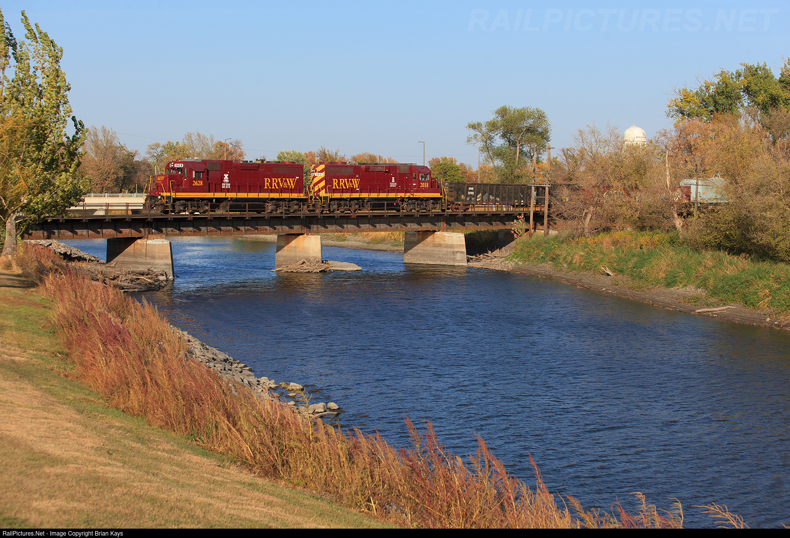 | Red River Valley & Western 2628 and 2018 back their train into the western section of the yard and cross the Bois de Sioux River separating Wahpeton, North Dakota and Breckenridge, Minnesota. Timing worked out that I was in the right place at the right time to be able to grab a couple of photos of this interstate bridge crossing. |