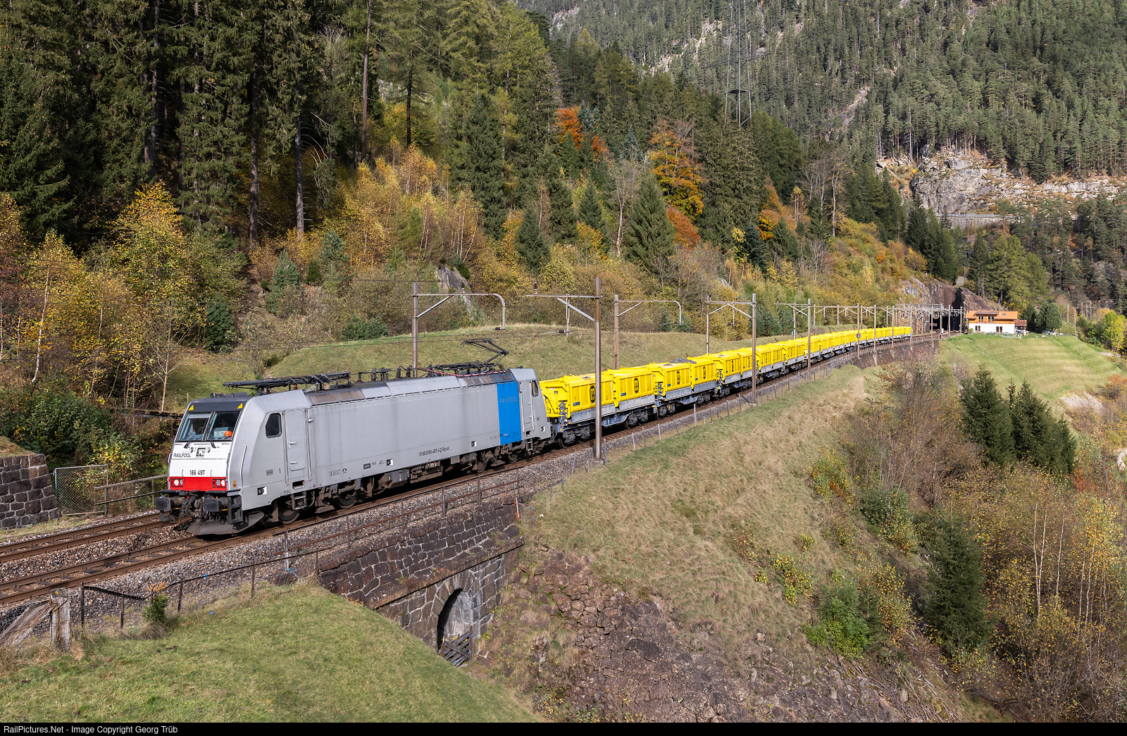 Bombardier TRAXX F140 MS 186 # 497 of the Railpool Gmbh, Munich, rented to TR TransRail, pulls the empy excavation train 67663 from Flüelen to Airolo, between Wassen and Göschenen on the Gotthard north ramp. Material produced during the construction of the second tube of the Gotthard road tunnel between Airolo and Göschenen is transported by rail to Flüelen, where it is deposited in Lake Uri (part of Vierwaldstättersee) to form shallow water zones. The cars are of type Sggrrs owned by VTG, consisting of two 4-axle units connected by a rod, with 4 yellow tiltable "Marti" containers . The train of today has 7 of the double cars with a total of 56 axles and a capacity of about 900 ton.