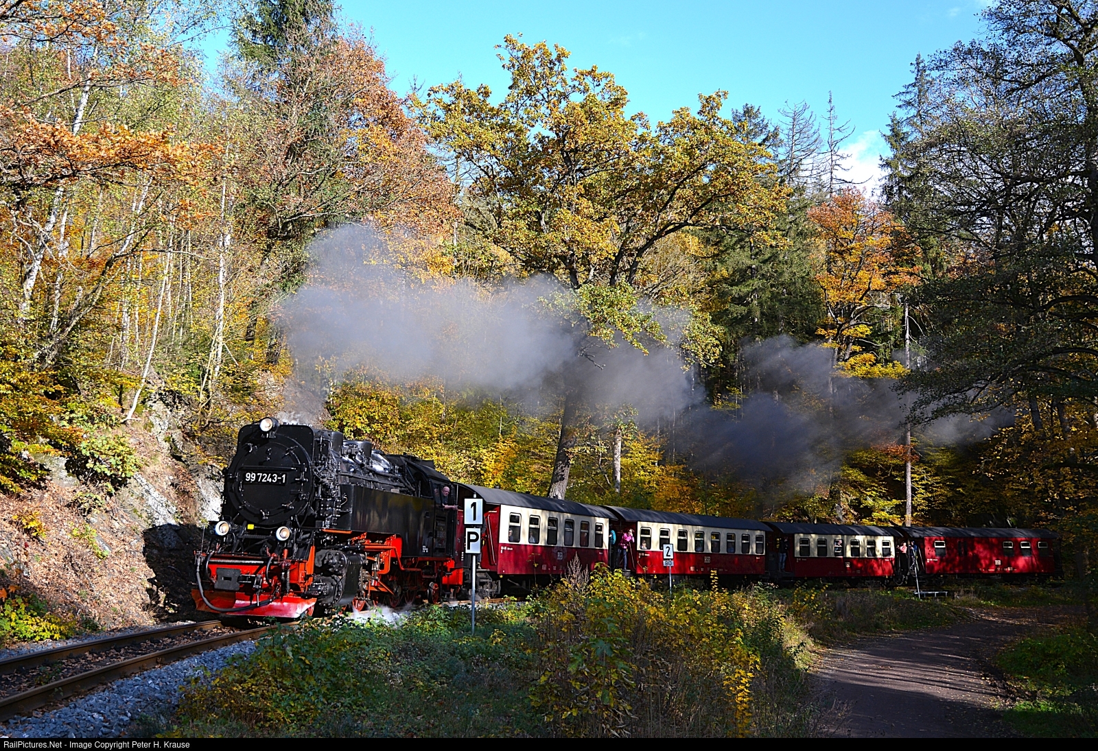| With the second passenger train on the Selketalbahn, 99 7243 is heading to the stopover station Drahtzug on this bright fall morning, with leafs in full foliage. |