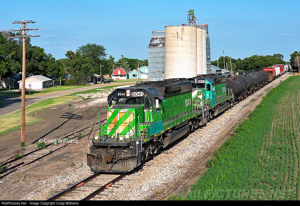 | We rolled into Phillipsburg on our way back home. Much to our surprise, a crew jumped onboard the Salina to Limon local freight and left. Much to my dismay, they had these 2 POS for power. It had came in with a Utah leading, but was pulled in favor of this. The job pokes west at 10mph as it rolls off into the Kansas evening. |