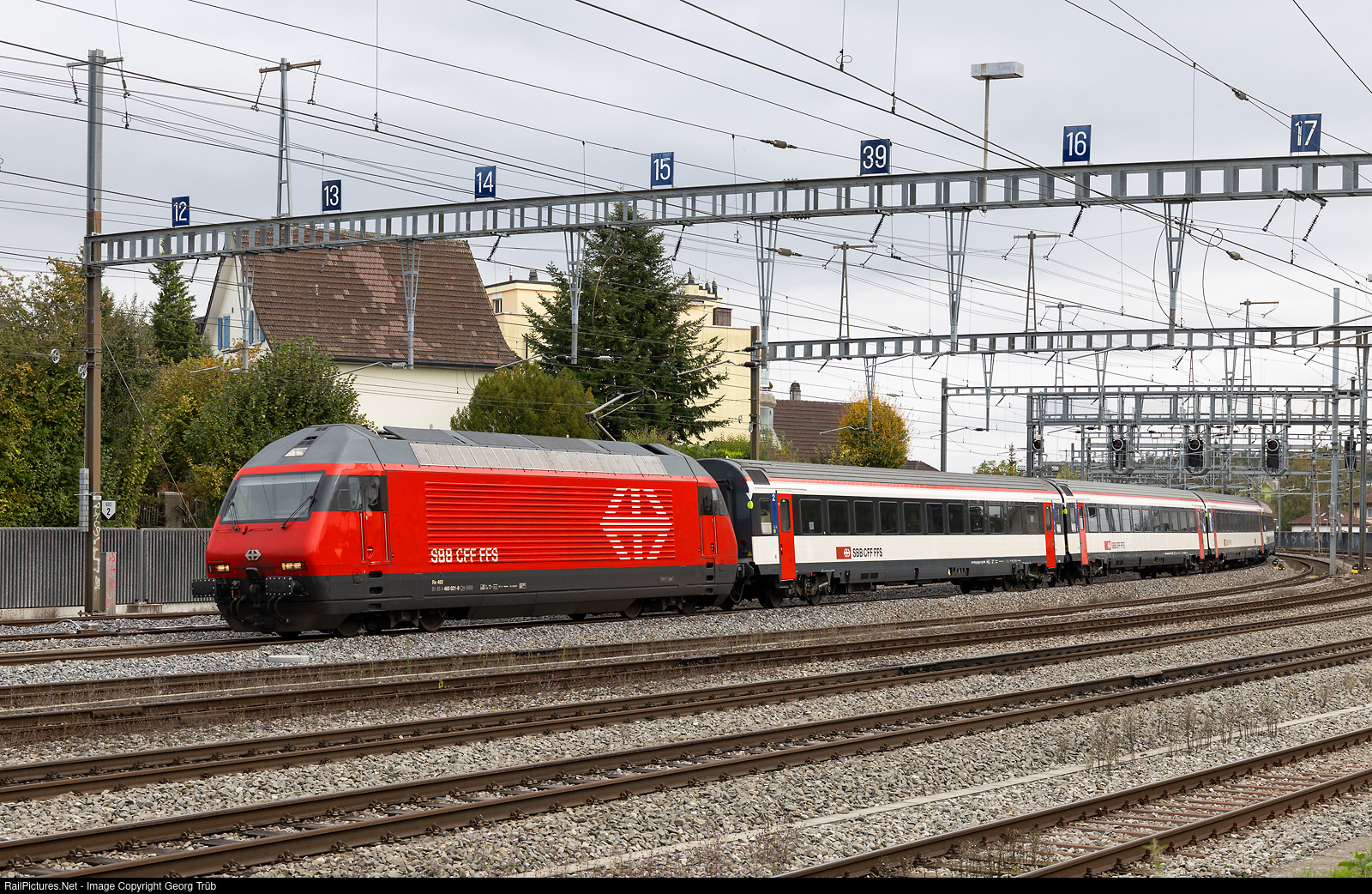 | A Re 460 locomotive is very rare in Biel. Re 460 # 021 of the SBB is entering Biel/Bienne with the soccer supporter train 27982 from Winterthur to Lausanne. The passengers are on the journey to the match Winterthur versus FC Lausanne-Sport of the Swiss Super League. |