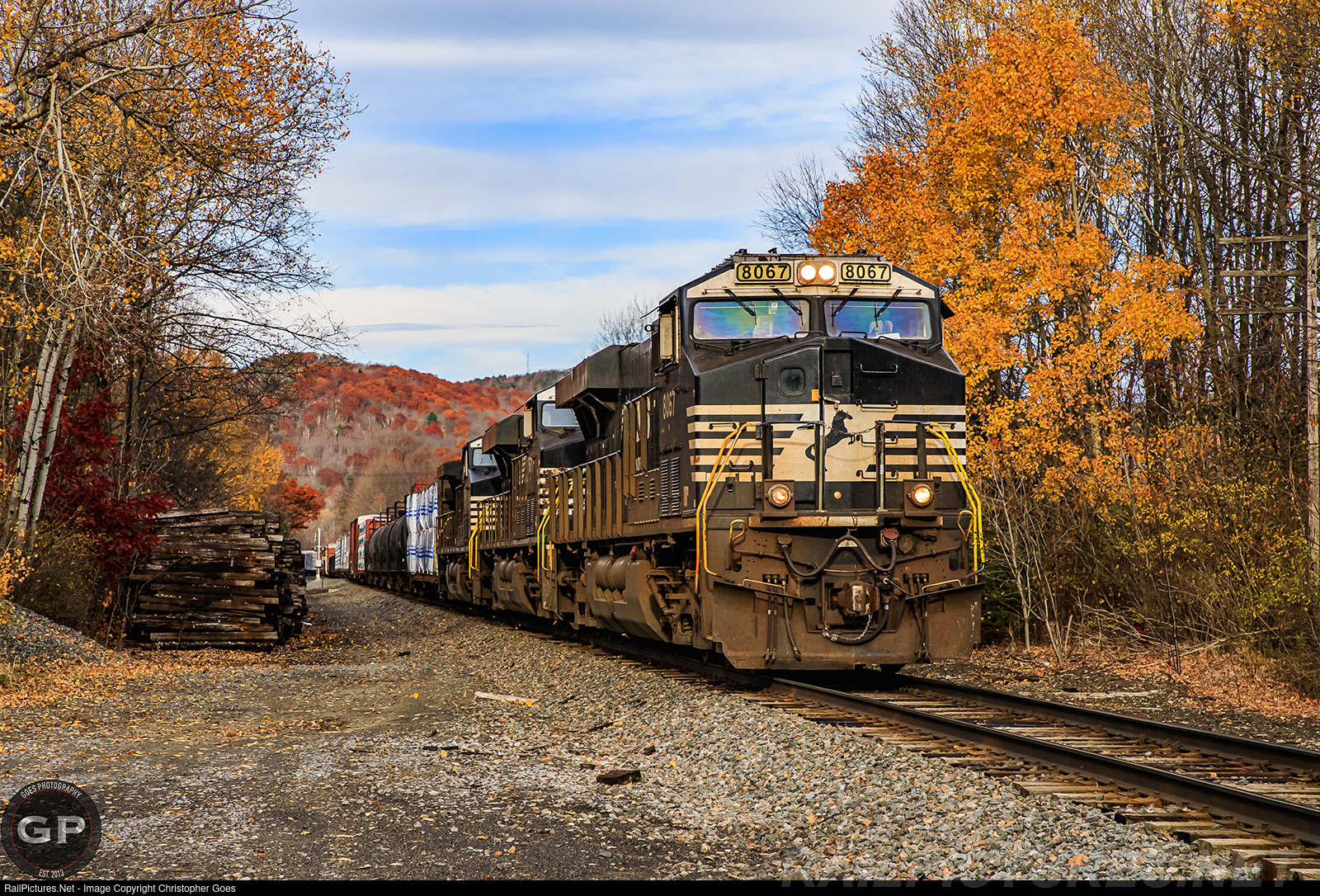 | NS 8067 & two other black horses "elephant style" lead the short 30T south stirring up the freshly fallen leaves at as it cruises out of Richmondville through East Worcester in the early evening. |