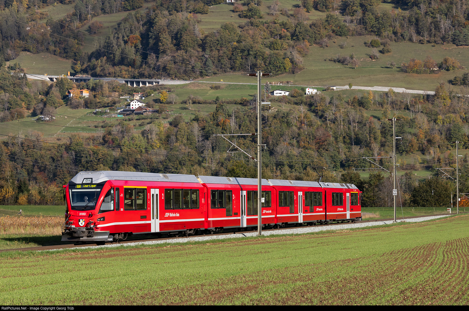 | "STZ" Stammnetz Triebzug ABe 4/16 # 3103 of the Rhaetian Railway is running the S2 service 1508 from Rhäzüns via Chur to Landquart, between Bonaduz and Reichenau-Tamins. |