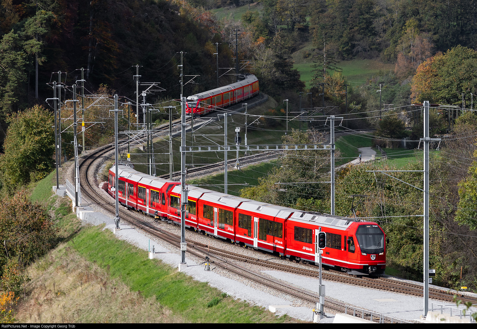 Near the bridges over the Hinterrhein at Reichenau-Tamins. The RE7 1732 from Disentis/Mustér via Ilanz to Chur with "Capricorn" trains ABe 4/16 # 3164 and # 3123 in multiple control will cross the old bridge shotly. In the background, on the line from Bonaduz before the entrance signal of the Farsch bifurcation is the IR 1132 of the line IR38 from St.Moritz, with Ge 4/4 III # 648 "watson" in the rear, waiting for a free track. The track over the new bridge will be used shortly by the S1 service from Chur to Thusis.