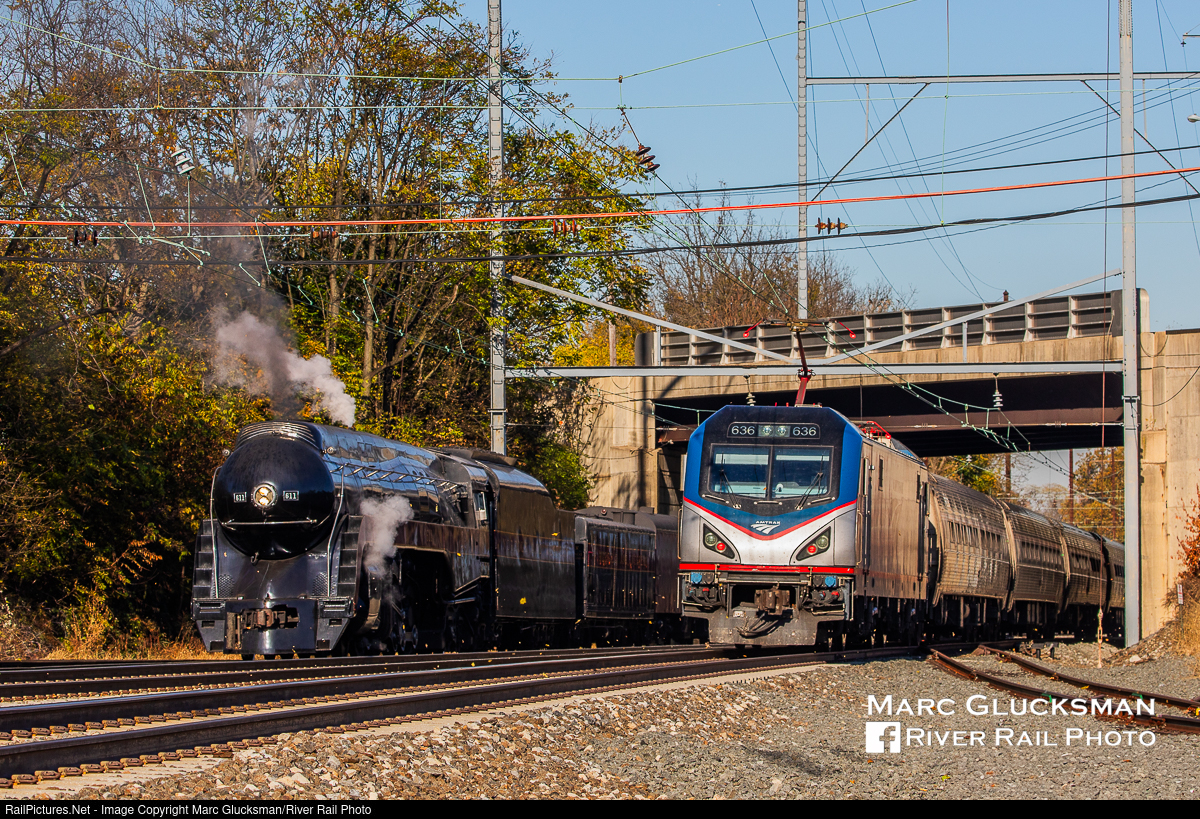 The Queens Of Steam Leaves Paradise. On Monday, October 28, 2019 the Virginia Museum of Transportation's former Norfolk and Western Railroad J Class 611 (4-8-4) was moved out onto the Strasburg Railroad's interchange at Leaman Place and picked up by Norfolk Southern for the trip to the North Carolina Transportation Museum in Spencer, NC. As the only ferry move of this round of trips where the engine trailed, it presented some unusual photo opportunities. The 611 is sitting near Leaman Place in Paradise, Pennsylvania as an Amtrak Keystone train passes with ACS-64 AMTK 636 trailing.