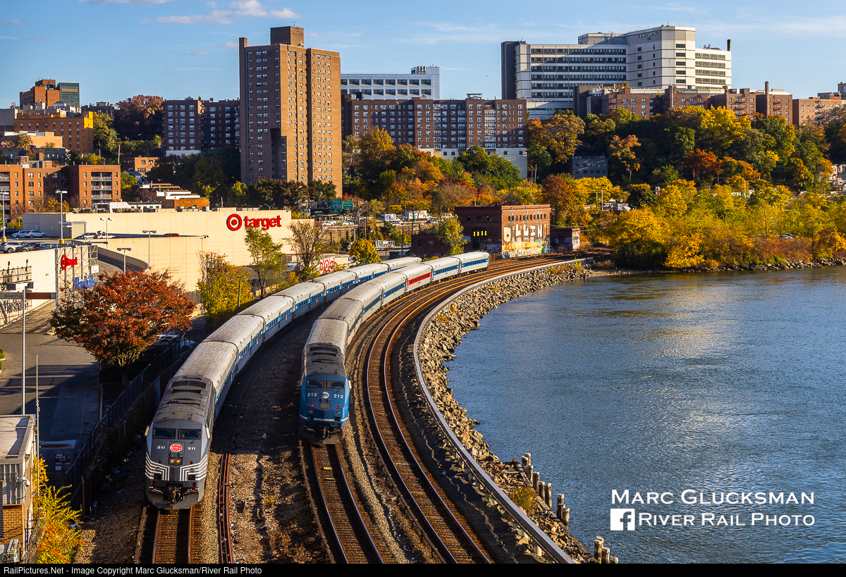 Meet At Marble Hill. On the afternoon of October 26, 2024, a nice sequential comparison meet shot presented itself on the curve at Marble Hill in New York, New York as MTA Metro-North Railroad Train 8741 with MNCW 211 (New York Central Railroad tribute) was heading to Poughkeepsie passing MNR 4144 with MNCW 212 heading to Grand Central Terminal in the standard MNR paint scheme. In the background at track level is a former New York Central power sub station, and above to the right is the Bronx VA Hospital. They are framed by the colorful remains of peak fall foliage.