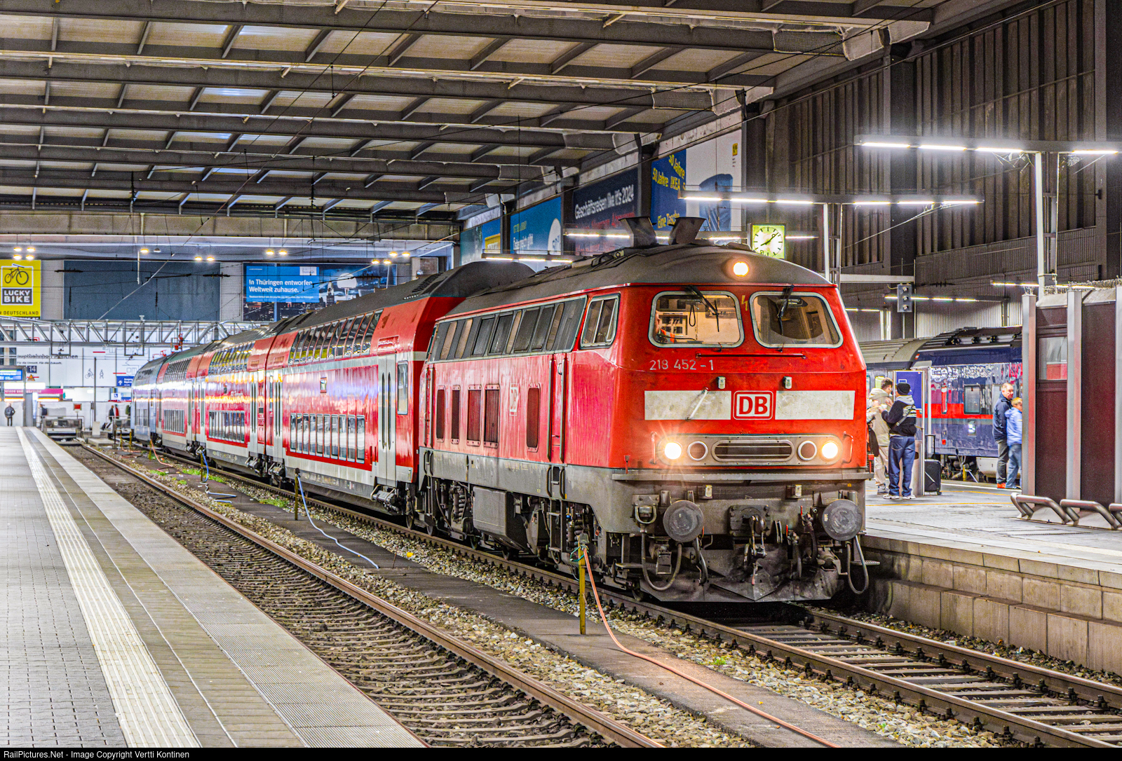 | The sound of MTU TB11 diesel engine echoes in the station hall in München Hbf where DB class 218 452 can be seen preparing to take 20:26 RB40 service to Mühldorf at München Hbf |