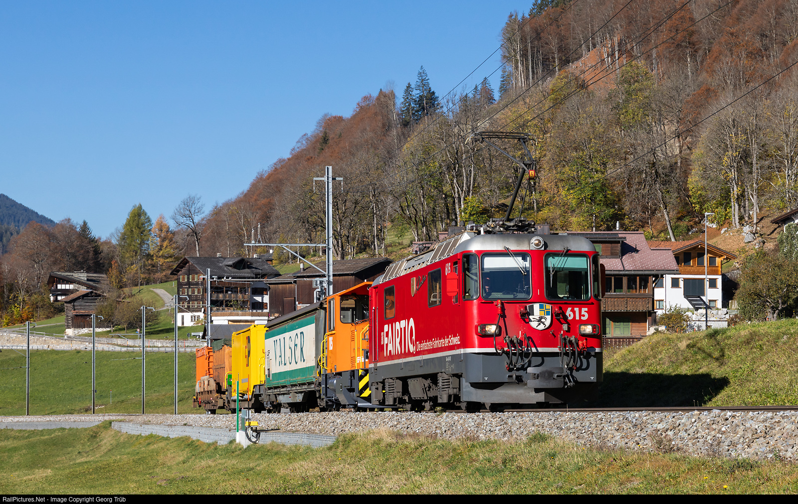 | Ge 4/4 II # 615 "fairtiq" of the Rhaetian Railway pulls the freight train 5225 from Chur freight yard via Landquart to Scuol-Tarasp, between Serneus and Klosters Dorf. |