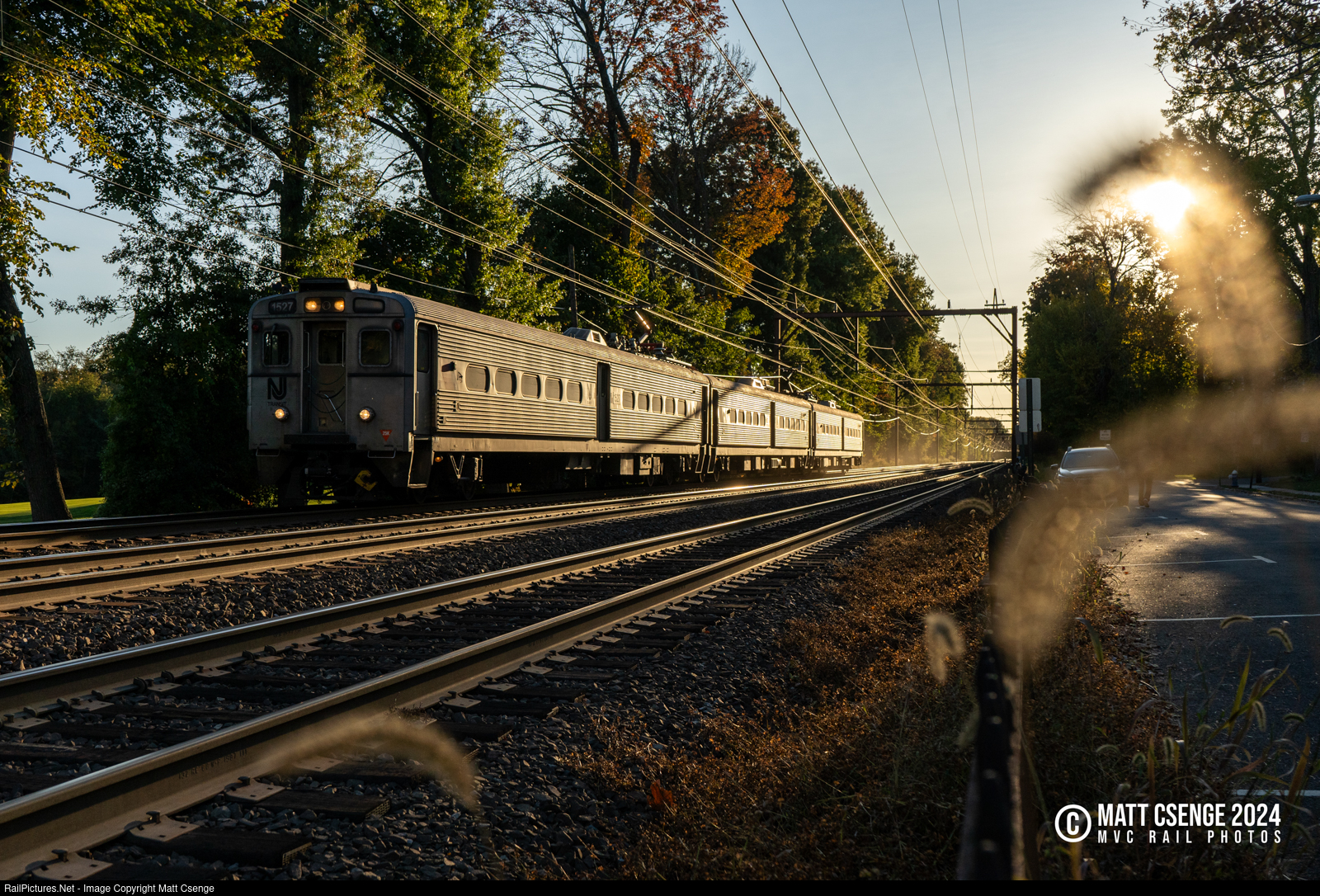 Just as the sun begins to sink behind the trees, NJ Transit Arrow III car 1527 comes racing through the town of Maplewood with Gladstone Branch train 430 to Hoboken. |