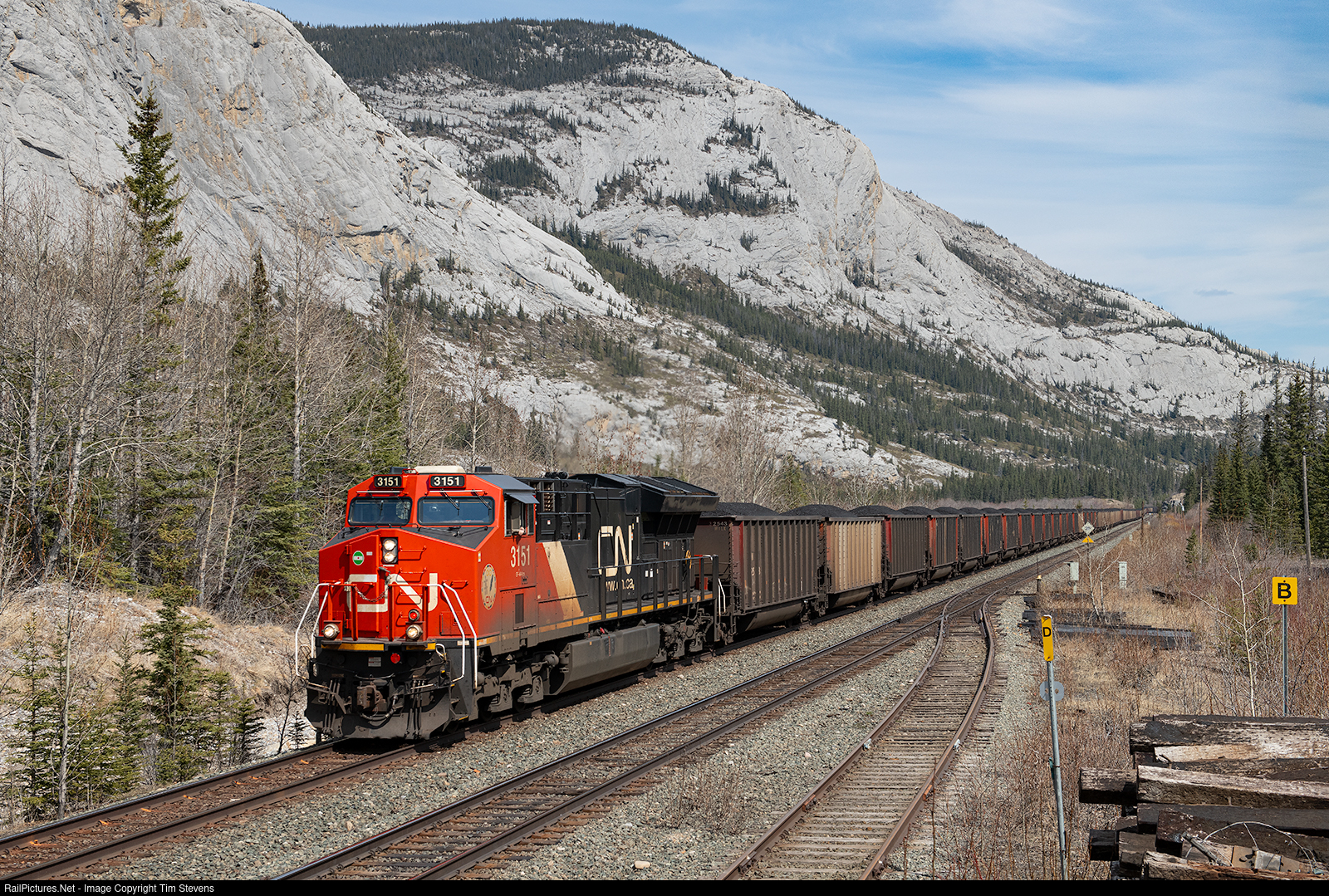 CN ET44AC 3151 leads a train of 220 loaded coal cars west on the north track of CN's Edson Sub west of Park Gate.