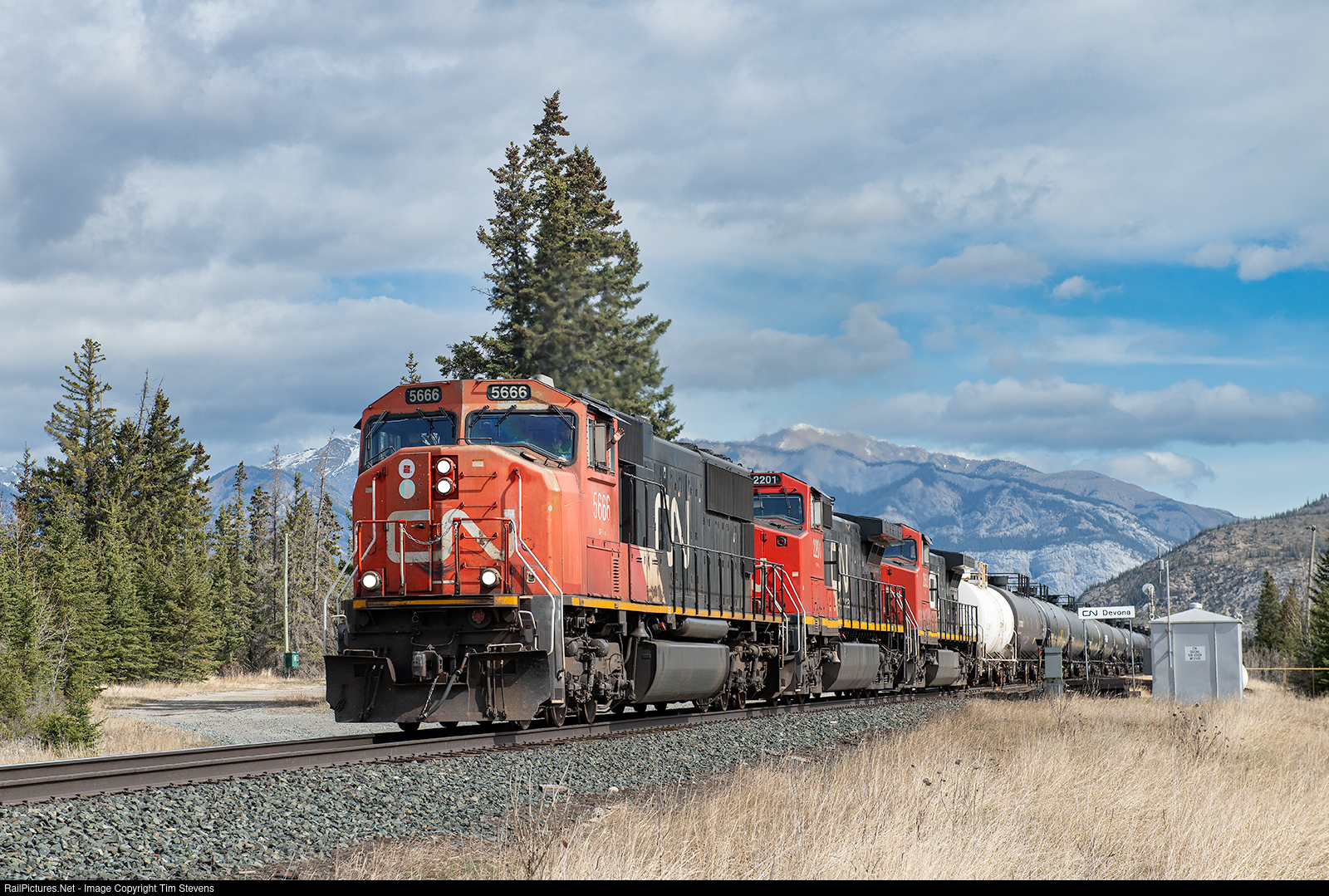 | All facing west, CN 5666, CN 2201 and CN 2652 lead loaded LPG train U711 onto the single track at Devona. |
