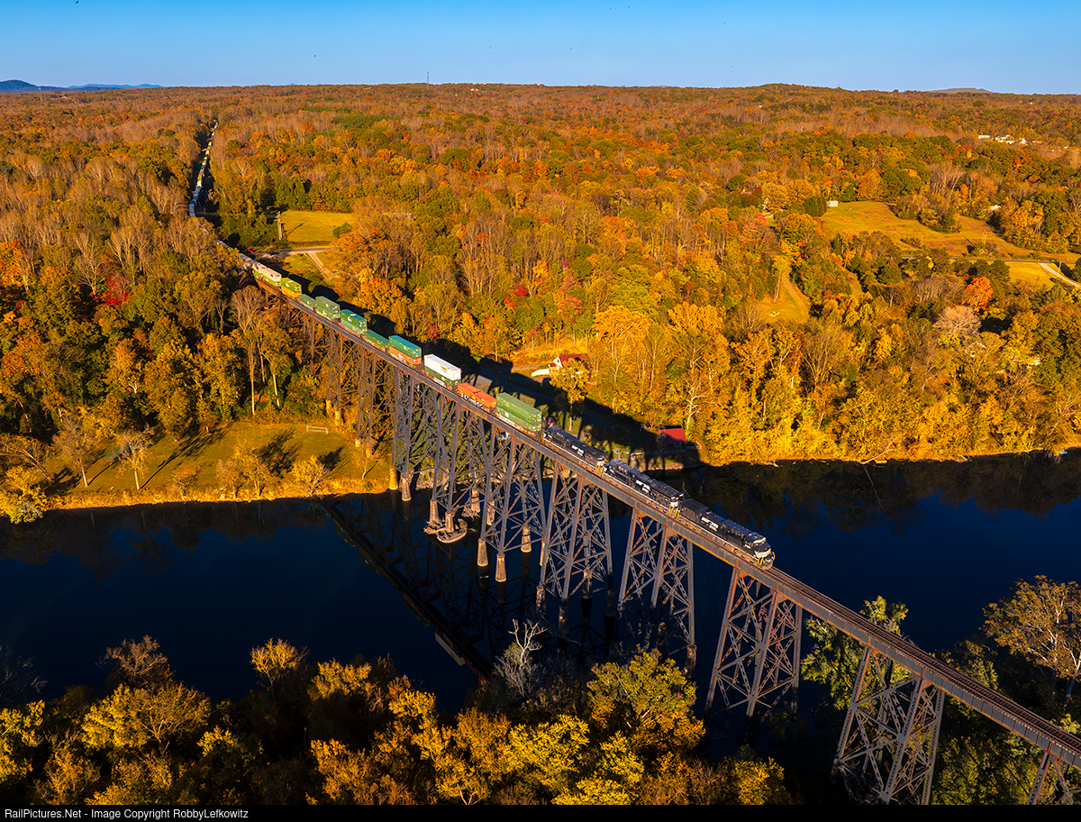 Trestle Time: NS 4581 leads hotshot intermodal train NS 25A southbound into Lynchburg, Virginia, as the train crosses over the James River Trestle Bridge.