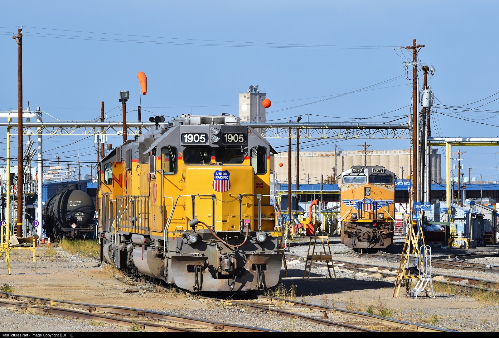 | UP heavy #2673 (ES44AC) sits at the fueling station in the North Yard in Denver, Colorado while UP 1905 waits for an assignment.