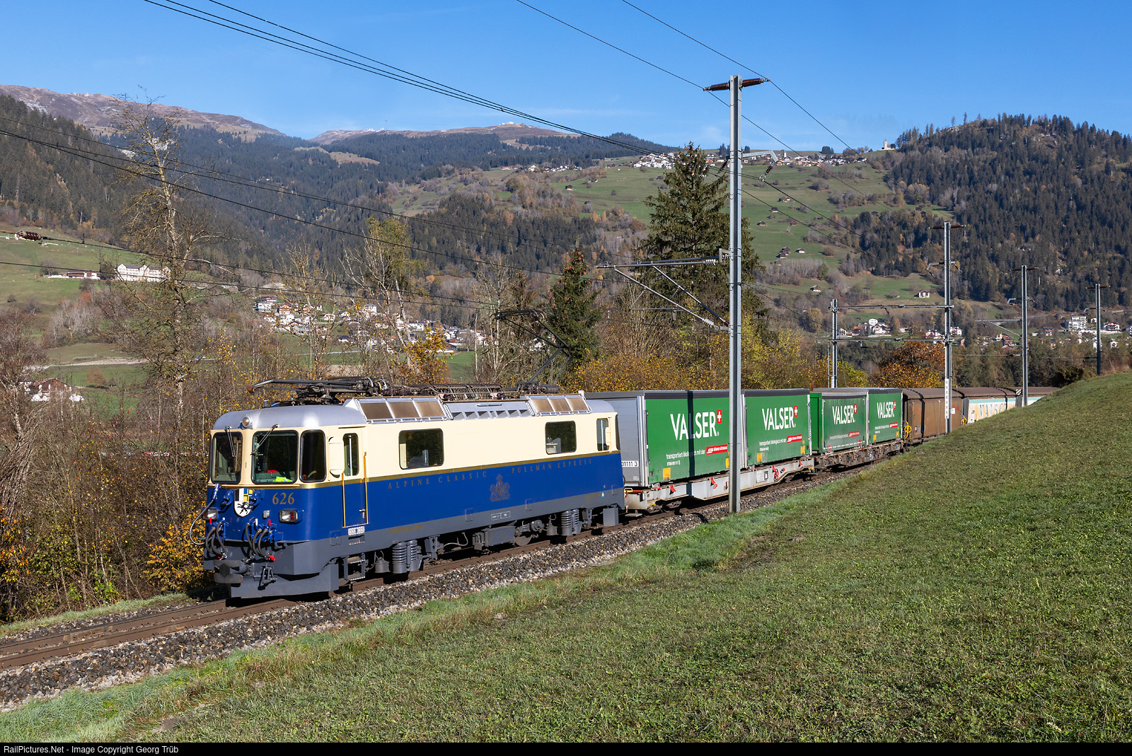 | Ge 4/4 II # 626 of the Rhaetian Railway in the cobalt blue/ivory "Pullman" paint scheme pulls freight train 5725 from Landquart freight yard to Ilanz, between Castrisch and Ilanz, with Falera in the background. |