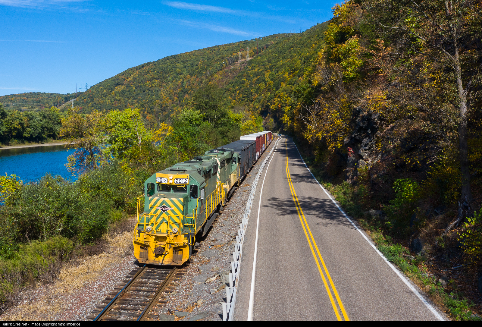 | The Reading & Northern's PIME job makes their return trip from Mehoopany as they follow the Susquehanna River through the valley south of Ransom, Pennsylvania. Today's train has two GP's on the head end as well as one bringing up the rear as they approach the yard in Pittston. |