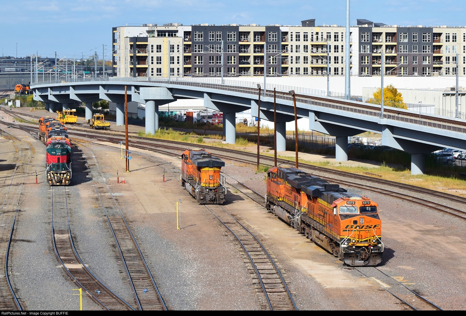 | BNSF 6372 (ES44AC) joins other power waiting in the yard of the engine service facility in Denver, Colorado. |