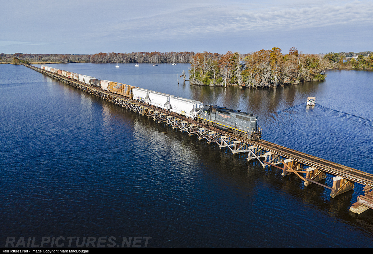 Carolina Coastal 119 crosses the Pamlico River Bridge in Washington on the original NS main.