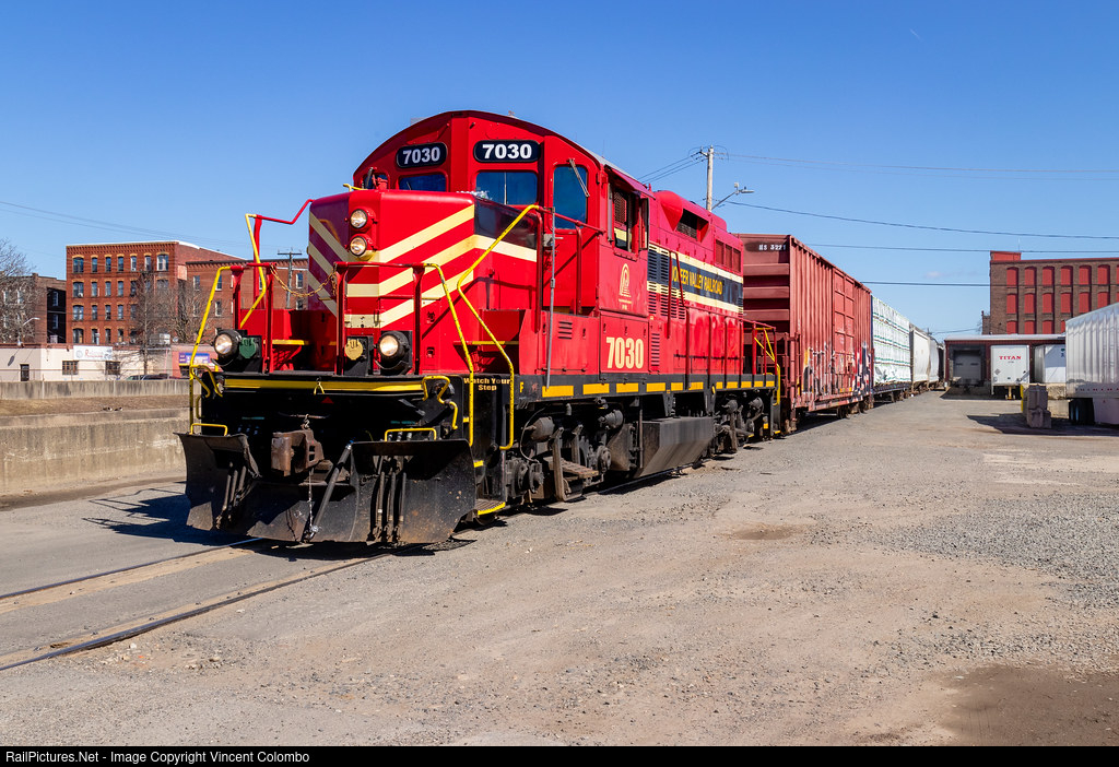 | Coming back from the interchange, Pioneer Valley GP9RM 7030 trundles down busy Water St. in Holyoke, MA. |