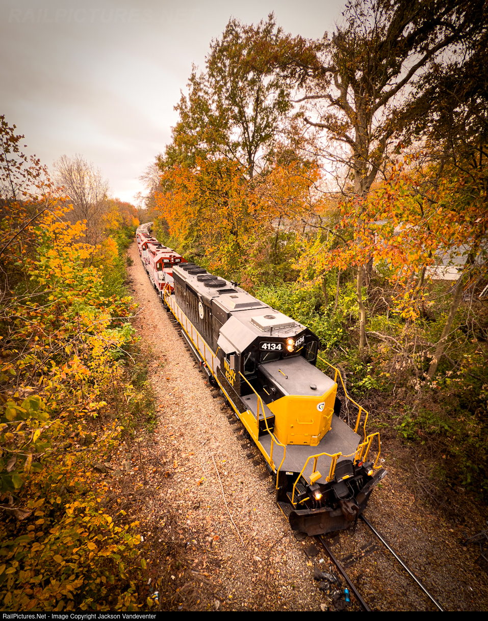 | Oakland empties traverse the twists and turns of the Charleston Subdivision on the south side of Charleston. Ruining the pure WSOR consist is the leader, WAMX 4134, the DREI’s lone “true” SD40-2. |