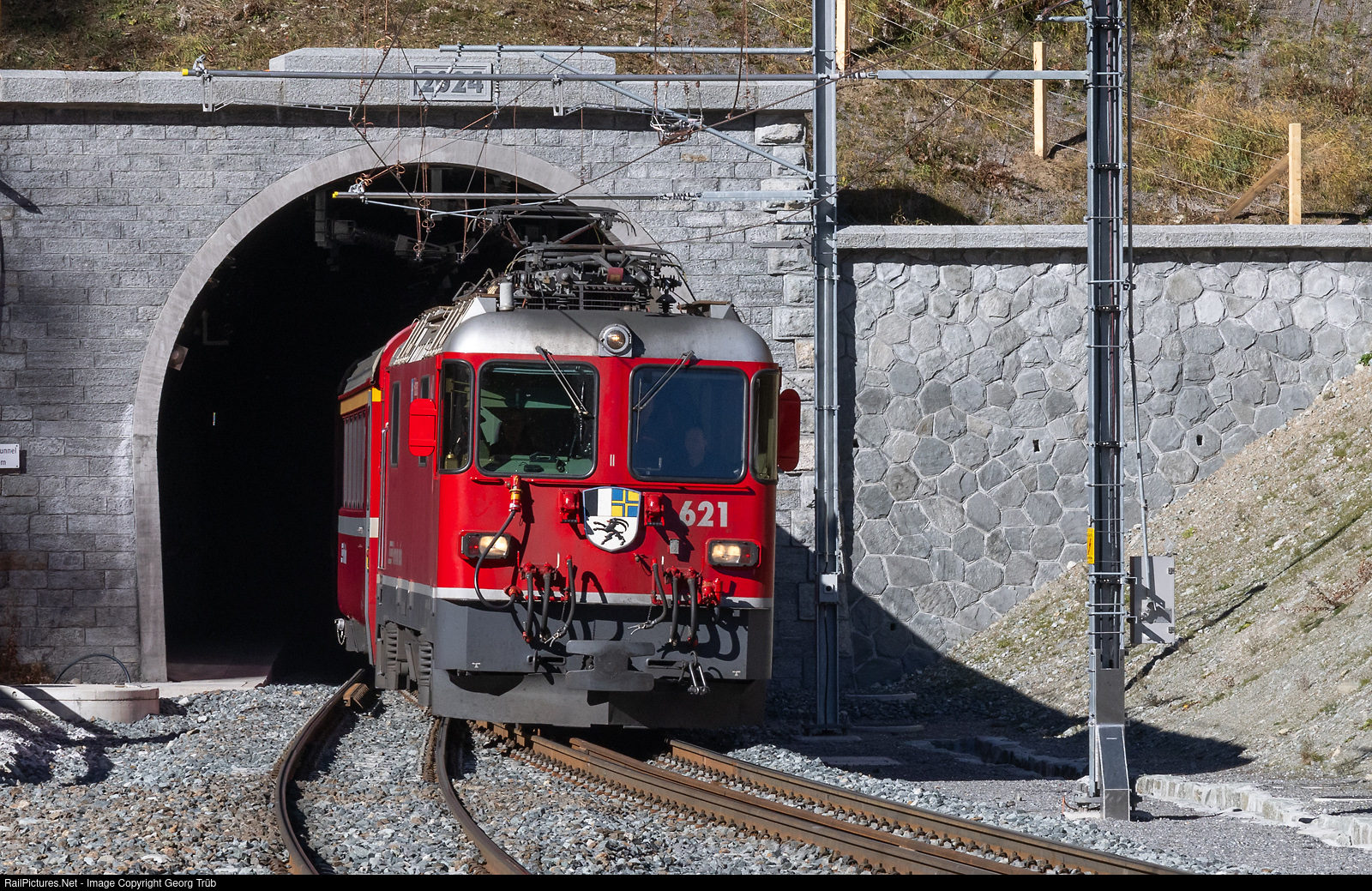 | Ge 4/4 II # 621 of the Rhaetian Railway is leaving the new 5860 meter long Albula II tunnel, built parallel to the old one, in Spinas with the IR 1129 of the line IR38 from Chur to St.Moritz. This was a push-pull replacement train this day with older cars. |
