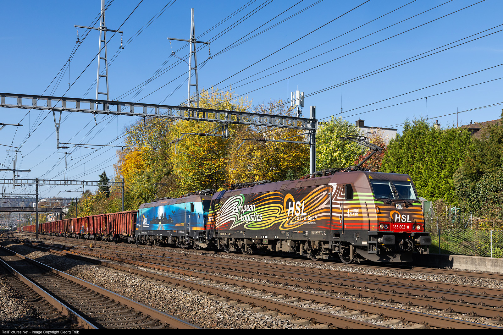 | Bombardier TRAXX F140 MS 185 # 602 and # 601 "Nightrider" of the HSL Logistik, both rented from the Beacon Rail Leasing, pull the about 2550 gross ton sugar beet train 45643 from Wismar/Mecklenburg-Vorpommern/Germany via Basel-Koblenz-Bülach-Winterthur to Islikon (Frauenfeld sugar works), between Winterthur and Oberwinterthur. |