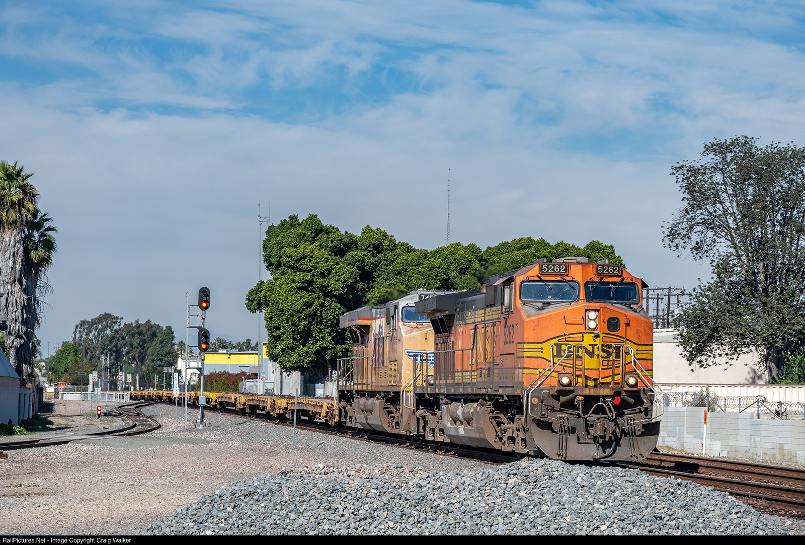 As BNSF train U-KCKSDG1-27M, a military unit train heading to San Diego CA from Kansas City KS, was crossing Cajon Pass on October 31, Union Pacific ES44AC 7455 was leading BNSF Dash 9-44CW 5262. And then the crew's hours of service expired, and the train sat just east of San Bernardino while the crew rested. When the fresh crew arrived (a new engineer, but the same conductor as the day before), they took the time to swap the two diesels so that BNSF Dash 9-44CW 5262 is now leading. Freights heading to San Diego hop onto Southern California Regional Rail Authority’s (Metrolink) trackage at Atwood, the BNSF San Bernardino Sub/SCAX Olive Sub junction in Placentia CA, and then travel on the short Olive Sub to SCAX' Orange Sub, as seen here, and eventually to the San Diego Northern's San Diego Sub to get to San Diego ... although this train may be going only as far as USMC Camp Pendleton, about 45 miles north of San Diego, to load tanks and other military vehicles. On the left the UP’s Santa Ana Industrial Lead splits off the Metrolink trackage to head to industries in the southern part of the city. (Santa Ana, California – November 1, 2024)