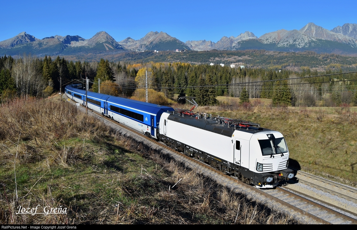 | The snow-white Vectron locomotive at the head of the interstate express train EC 241 Koši?an from Prague to Košice. |