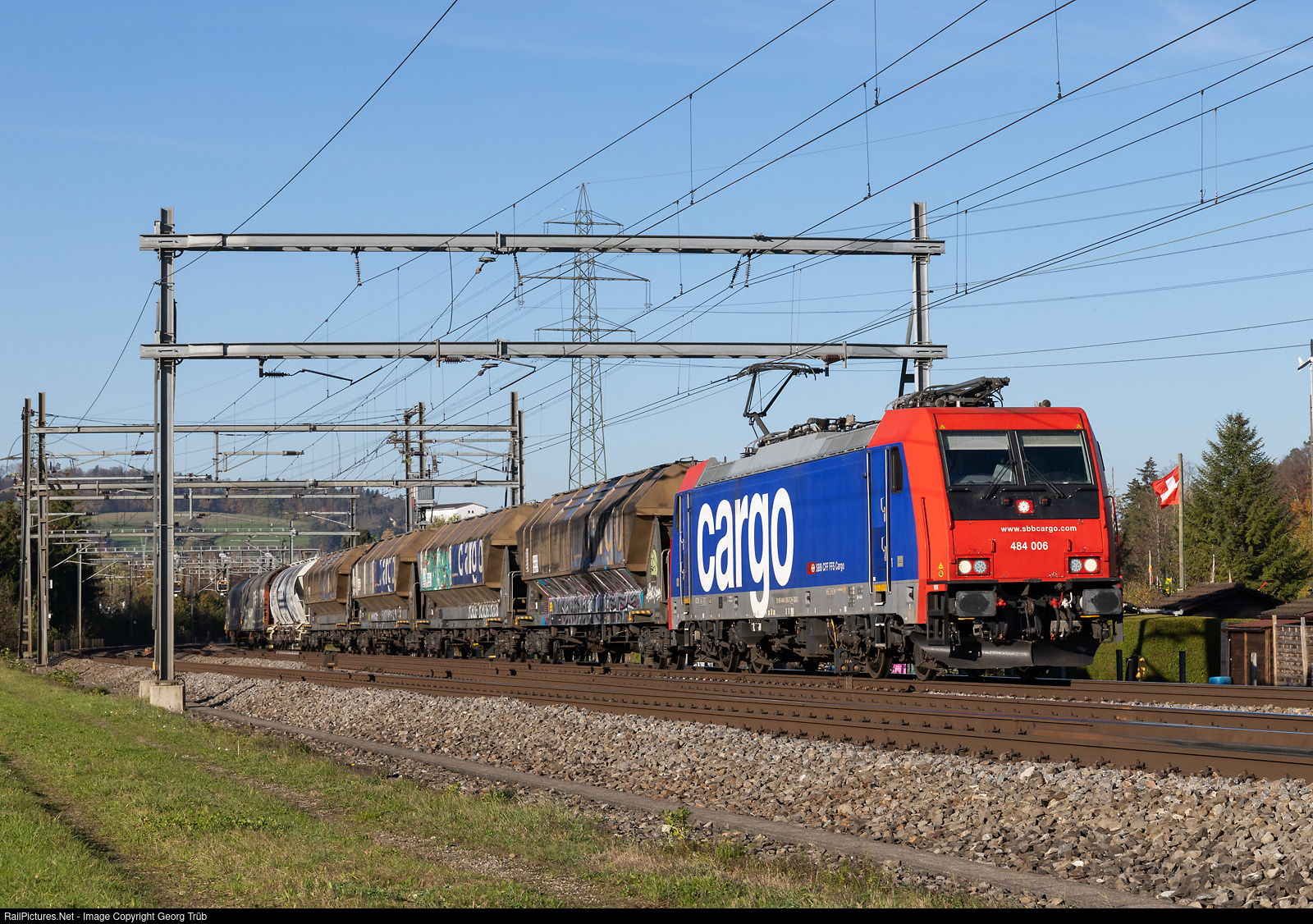 Bombardier TRAXX F140 MS Re 484 # 006 of the SBB pulls the freight train 63180 from St.Margrethen via Romanshorn VL-Frauenfeld-Winterthur-Kloten-Regensdorf to the Limmattal shunting yard (RBL), between Winterthur and Kemptthal.