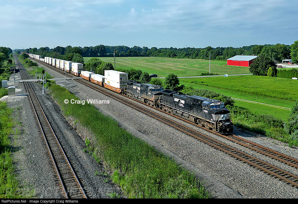 | North of Columbus, a small stack train works north on the NS Sandusky District. The train is makes good time using the 1st 31 miles of double track leaving Columbus without delay. In about 15 miles, the train will be into the railroad town of Marion. The 1st 20 or so miles out of Columbus, the NS and CSXT parallel each other. |