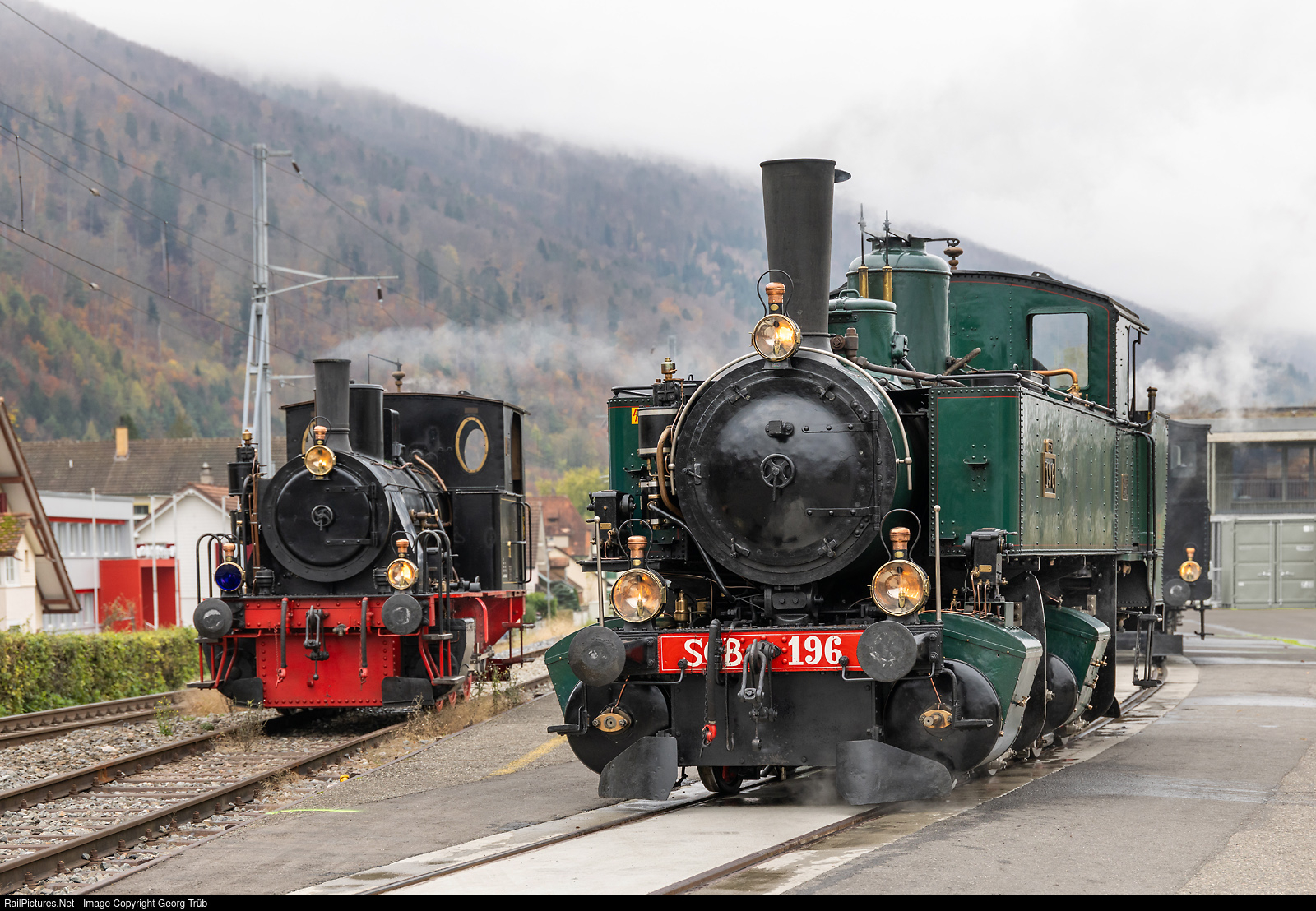 On the left, 0-6-0 T E 3/3 steamlocomotive # 1 of the Oensingen-Balsthal-Bahn (OeBB), now registered with OeBB Historic, on the occasion of the open doors day in Balsthal. On the right is "Mallet" Ed 2x2/2 # 196 of SBB Historic, built by J.A.Maffei in Munich/Germany in 1893 for the Schweizerische Centralbahn (SCB).