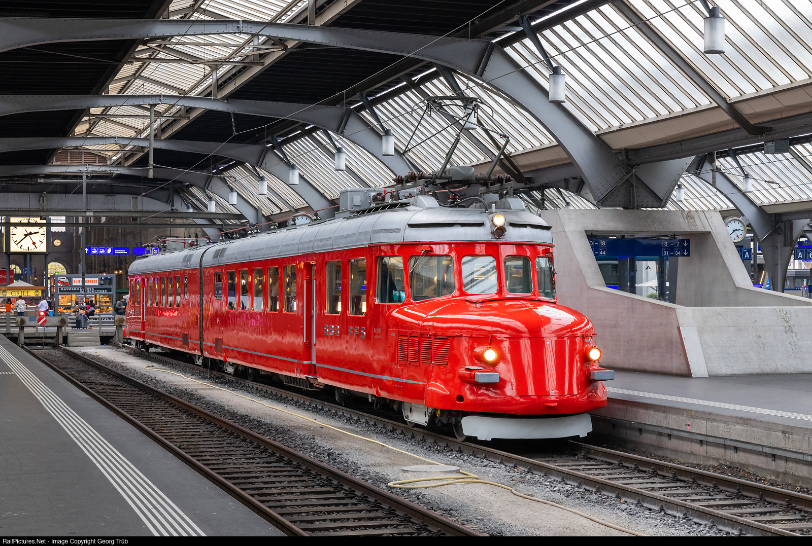 | Double red arrow "Churchill-Pfeil" RAe 4/8 # 1021 of the SBB in Zürich main station. This iconic vehicle was built in 1939 and got the name after WW II, when the english prime minister Sir Winston Churchill visited Switzerland and made some journeys with this railcar. |