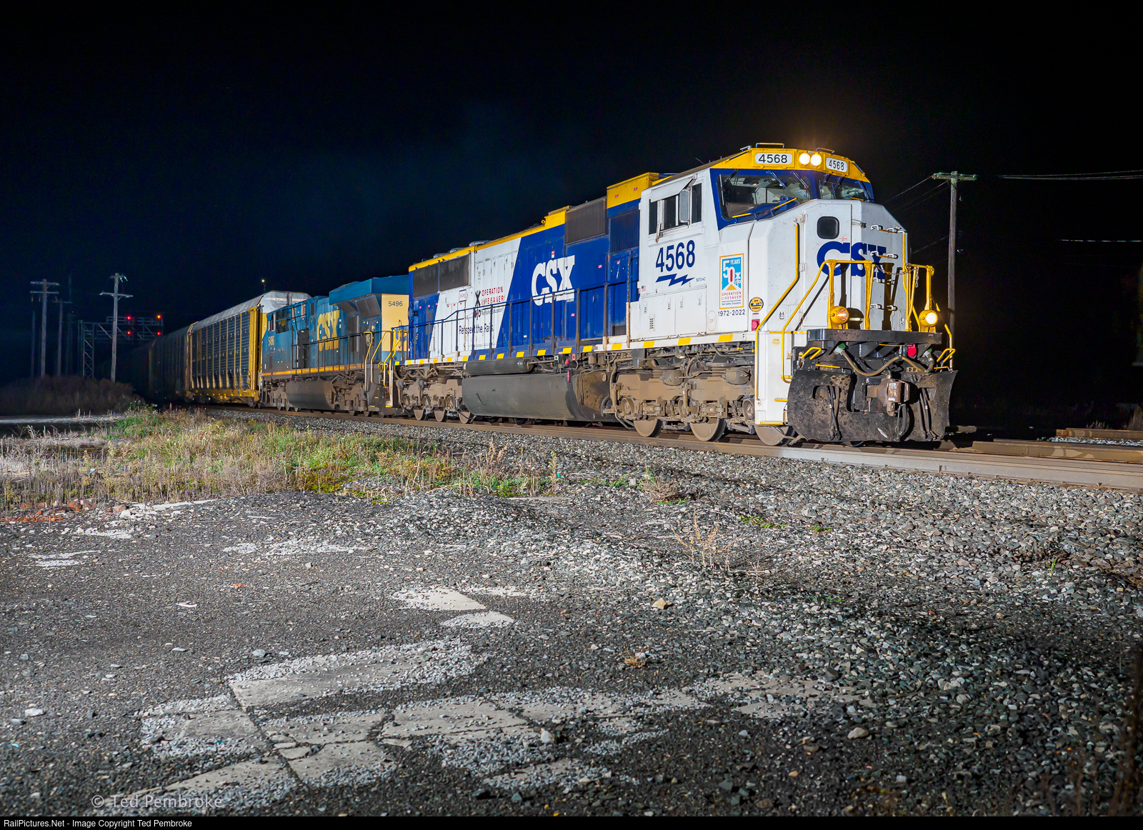 White at night: Respect the rails with the Operation Life Saver Locomotive. CSX 4568 is an EMD SD70AC painted in the special OLS theme. i168 Lyons 3Nov24.